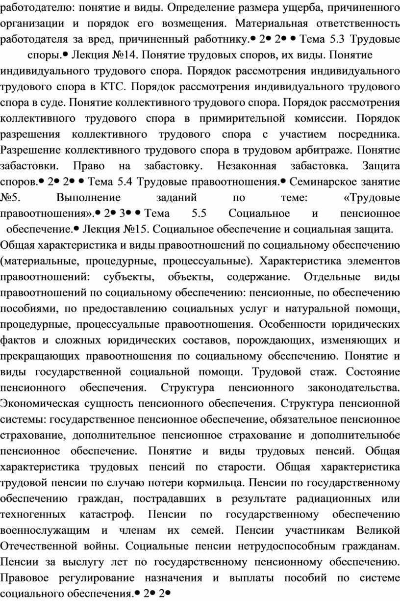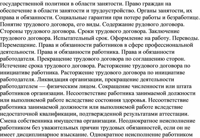 Лекция №12. Цели, задачи и основные принципы трудового законодательства. Понятие и виды правоотношений в трудовом праве. Трудовые правоотношения. Трудовая право и дееспособность. Нормативно-правовая база вопросов занятости и трудоустройства. Законодательство о занятости населения. Понятие занятости, безработного и подходящей работы. Основные принципы государственной политики в области занятости. Право граждан на обеспечение в области занятости и трудоустройство. Органы занятости, их права и обязанности. Социальные гарантии при потере работы и безработице. Понятие трудового договора, его виды. Содержание рудового договора. Стороны трудового договора. Сроки трудового договора. Заключение трудового договора. Испытательный срок. Оформление на работу. Переводы. Перемещение. Права и обязанности работников в сфере профессиональной деятельности. Права и обязанности работника. Права и обязанности работодателя. Прекращение трудового договора по соглашению сторон. Истечение срока трудового договора. Расторжение трудового договора по инициативе работника. Расторжение трудового договора по инициативе работодателя. Ликвидация организации, прекращение деятельности работодателем — физическим лицом. Сокращение численности или штата работников организации. Несоответствие работника занимаемой должности или выполняемой работе вследствие состояния здоровья. Несоответствие работника занимаемой должности или выполняемой работе вследствие недостаточной квалификации, подтвержденной результатами аттестации. Смена собственника имущества организации. Неоднократное неисполнение работником без уважительных причин трудовых обязанностей, если он не имеет дисциплинарное взыскание. Однократное неисполнение работником без уважительных причин трудовых обязанностей. Совершение виновных действий работником, непосредственно обслуживающим денежные или товарные ценности, если эти действия дают основания для утраты доверия к нему со стороны работодателя. Совершение работником, выполняющим воспитательные функции, аморального проступка, несовместимого с продолжением работы. Представление работником работодателю подложных документально или заведомо ложных сведений при заключении трудового договора. Другие основания, предусмотренные Трудовым кодексом и иными законами. Особенности расторжения трудового договора с некоторыми категориями работников. |