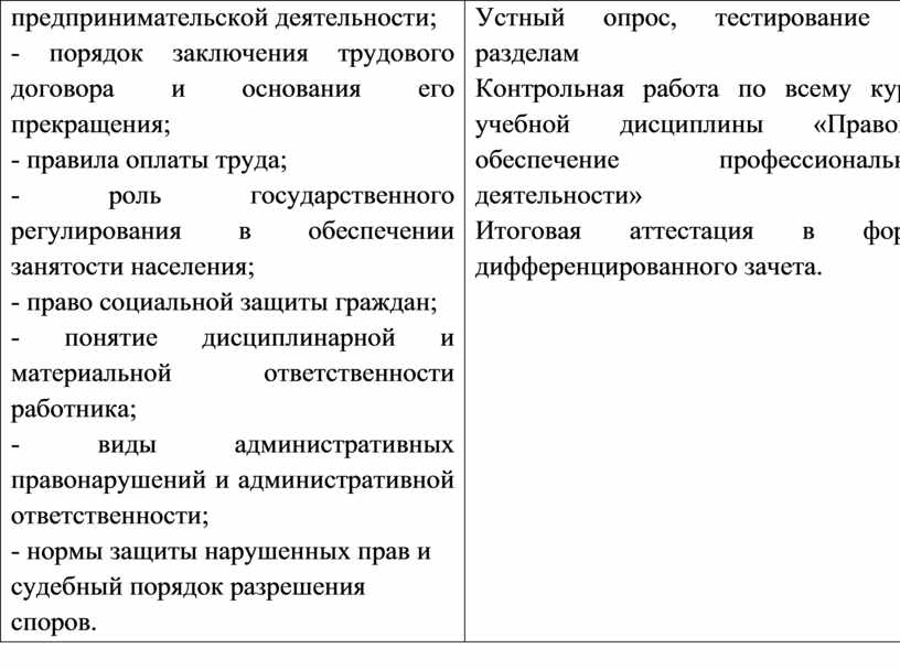 Устный опрос, тестирование по разделам Контрольная работа по всему курсу учебной дисциплины «Правовое обеспечение профессиональной деятельности» Итоговая аттестация в форме дифференцированного зачета. |