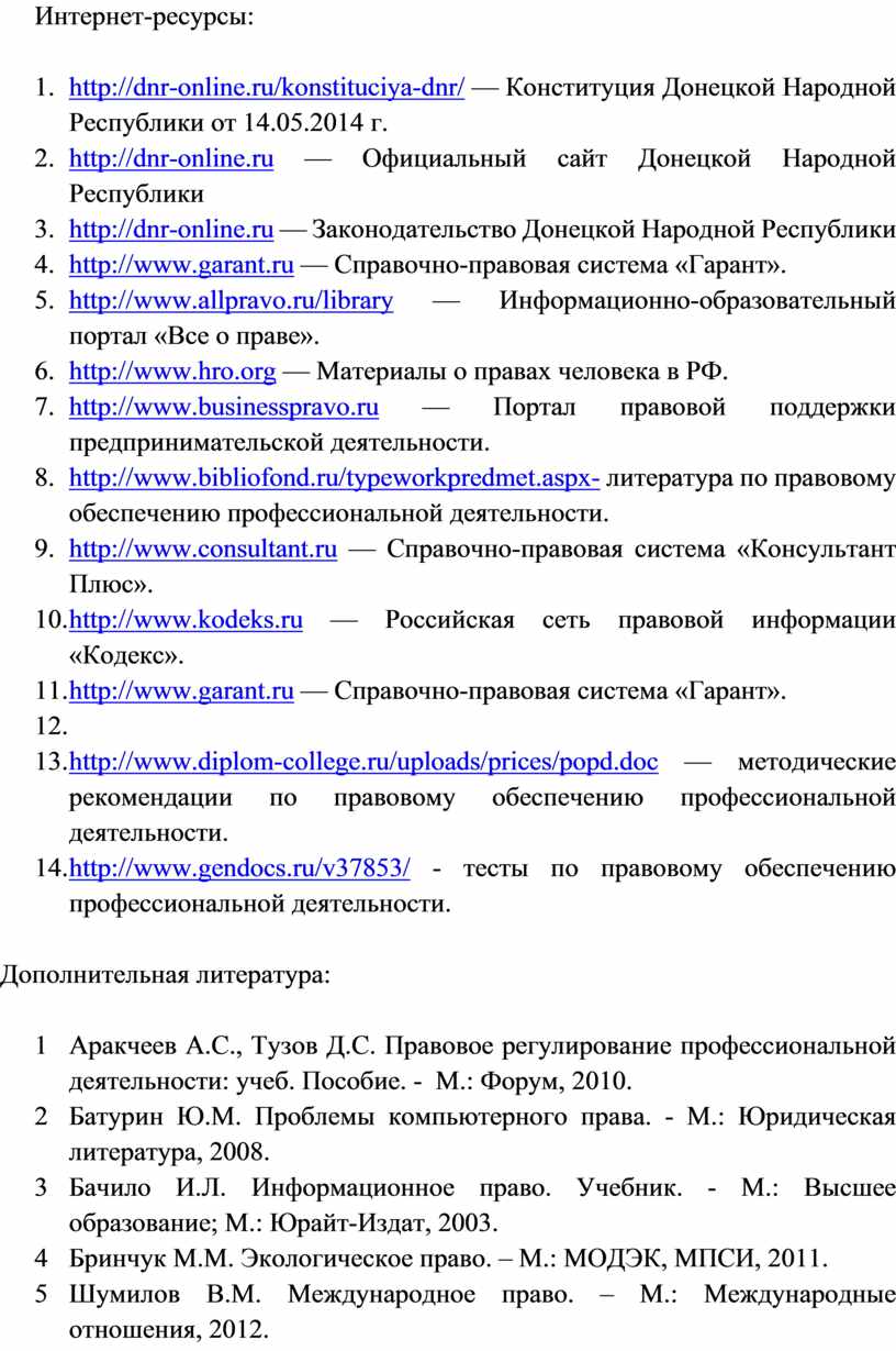 13. http://www.diplom-college.ru/uploads/prices/popd.doc — методические рекомендации по правовому обеспечению профессиональной деятельности.