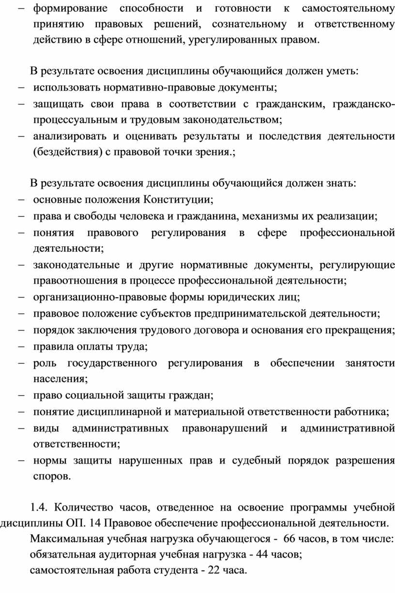 1.4. Количество часов, отведенное на освоение программы учебной дисциплины ОП. 14 Правовое обеспечение профессиональной деятельности.
