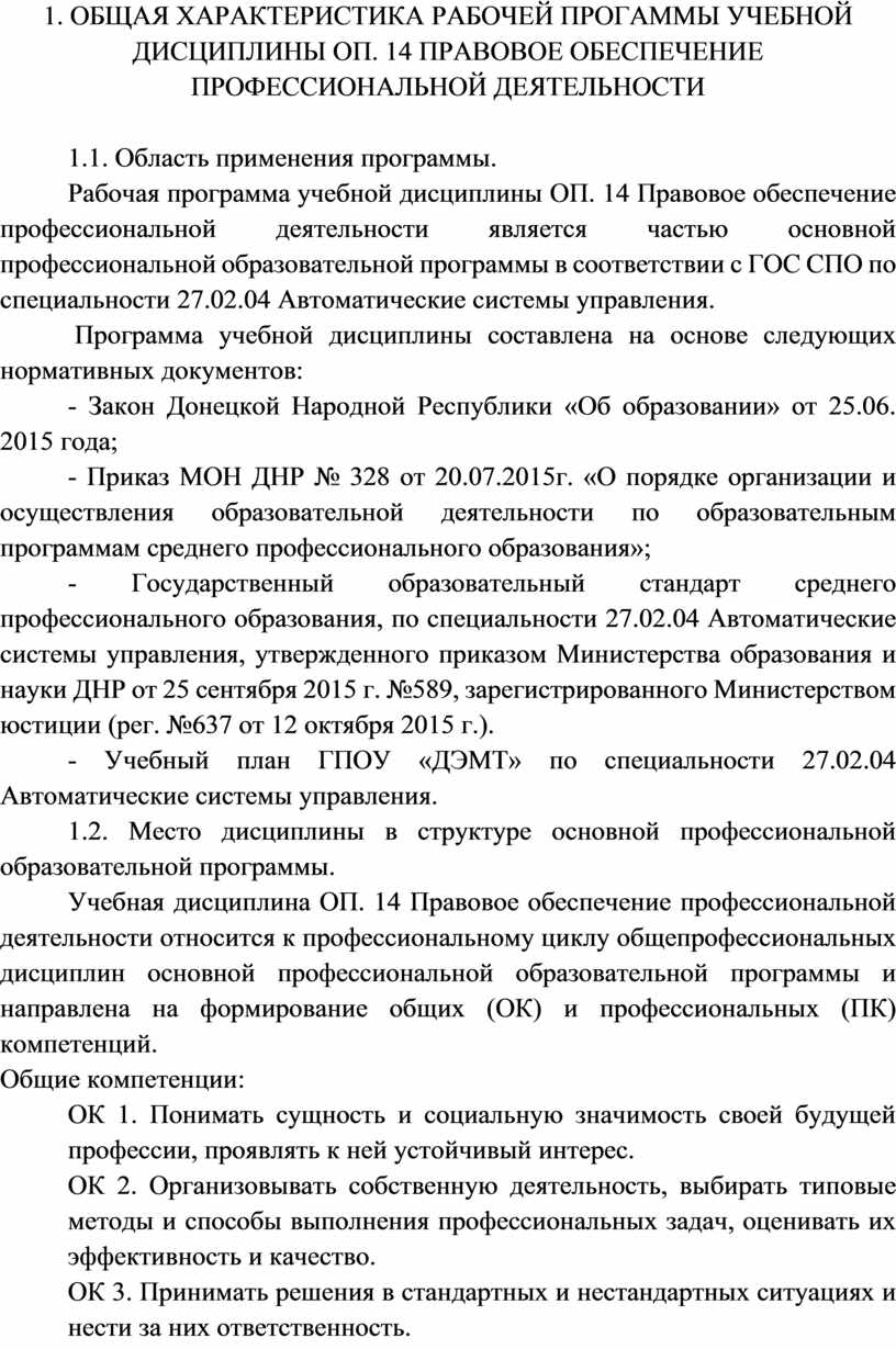 Рабочая программа учебной дисциплины ОП. 14 Правовое обеспечение профессиональной деятельности является частью основной профессиональной образовательной программы в соответствии с ГОС СПО по специальности 27.02.04 Автоматические системы управления.