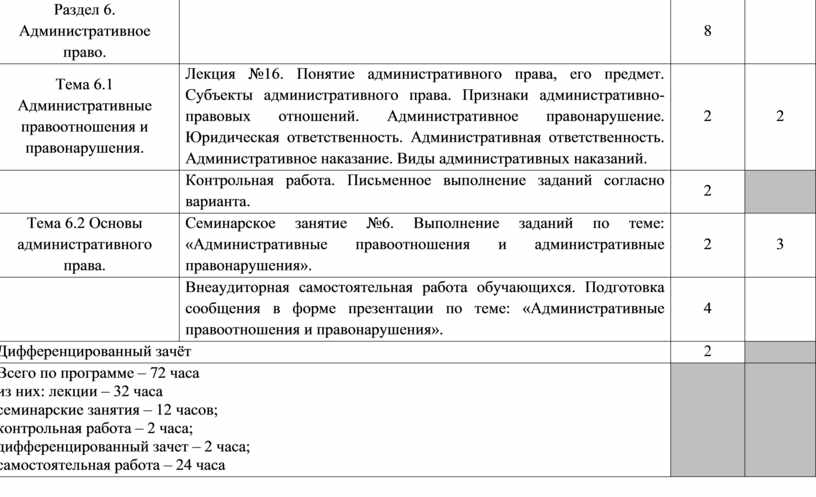 Всего по программе – 72 часа из них: лекции – 32 часа семинарские занятия – 12 часов; контрольная работа – 2 часа; дифференцированный зачет – 2 часа; самостоятельная работа – 24 часа |