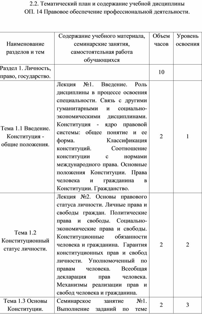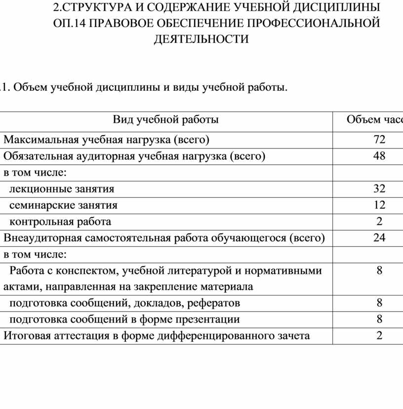 2.СТРУКТУРА и содержание УЧЕБНОЙ ДИСЦИПЛИНЫ ОП. 14 ПРАВОВОЕ ОБЕСПЕЧЕНИЕ ПРОФЕССИОНАЛЬНОЙ ДЕЯТЕЛЬНОСТИ
