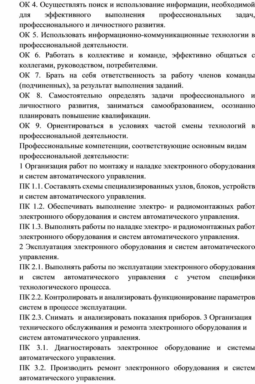 ПК 1.2. Обеспечивать выполнение электро- и радиомонтажных работ электронного оборудования и систем автоматического управления.