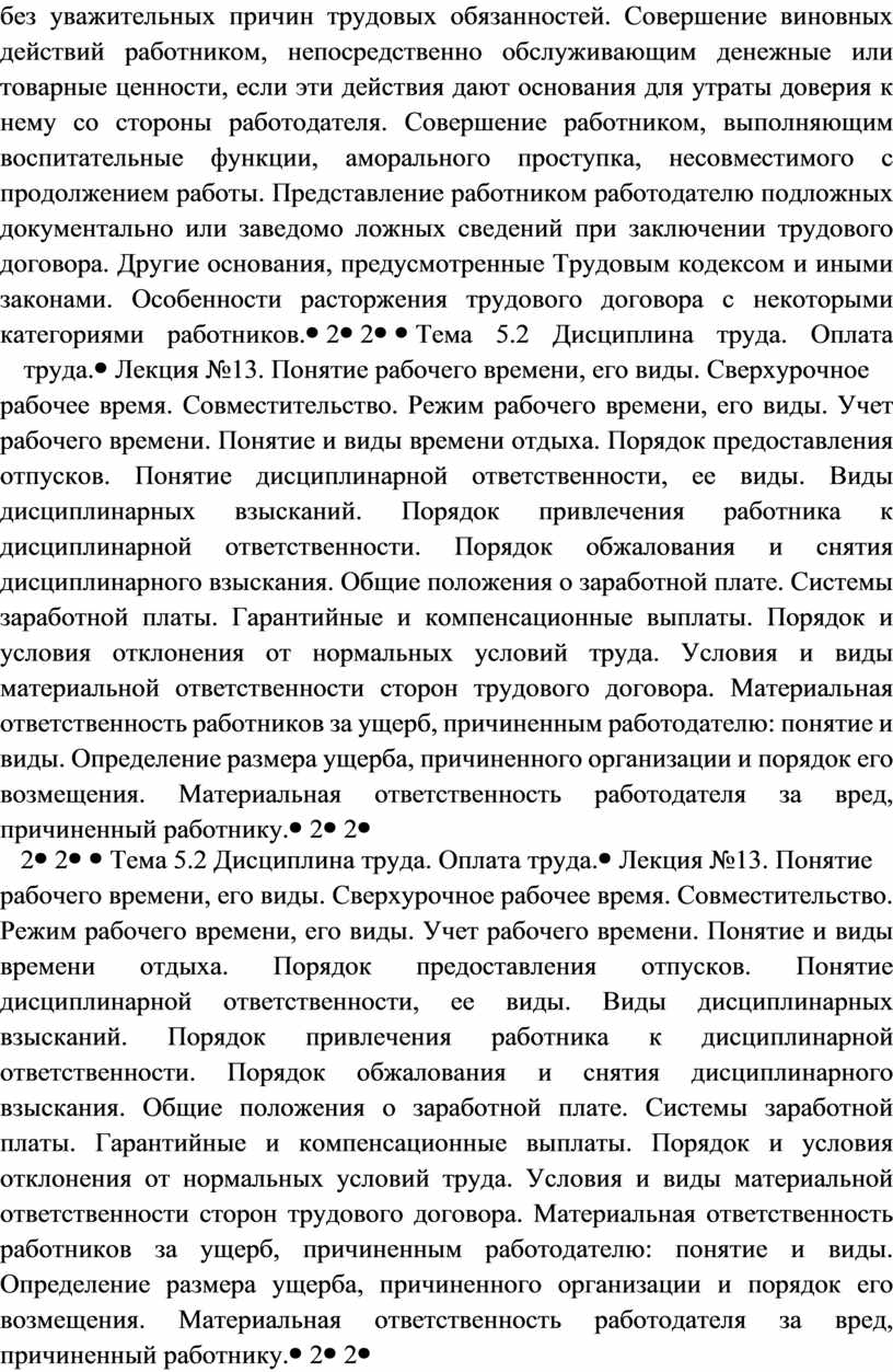 Лекция №13. Понятие рабочего времени, его виды. Сверхурочное рабочее время. Совместительство. Режим рабочего времени, его виды. Учет рабочего времени. Понятие и виды времени отдыха. Порядок предоставления отпусков. Понятие дисциплинарной ответственности, ее виды. Виды дисциплинарных взысканий. Порядок привлечения работника к дисциплинарной ответственности. Порядок обжалования и снятия дисциплинарного взыскания. Общие положения о заработной плате. Системы заработной платы. Гарантийные и компенсационные выплаты. Порядок и условия отклонения от нормальных условий труда. Условия и виды материальной ответственности сторон трудового договора. Материальная ответственность работников за ущерб, причиненным работодателю: понятие и виды. Определение размера ущерба, причиненного организации и порядок его возмещения. Материальная ответственность работодателя за вред, причиненный работнику. |