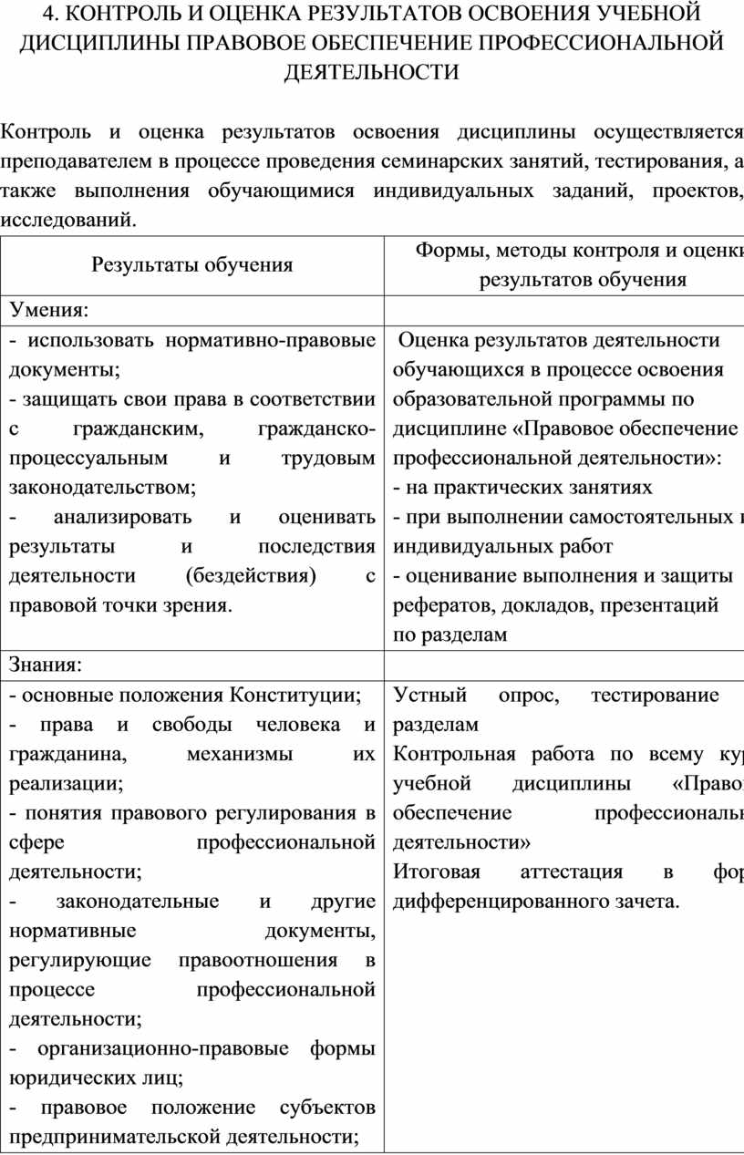 4. Контроль и оценка результатов освоения учебной Дисциплины ПРАВОВОЕ ОБЕСПЕЧЕНИЕ ПРОФЕССИОНАЛЬНОЙ ДЕЯТЕЛЬНОСТИ