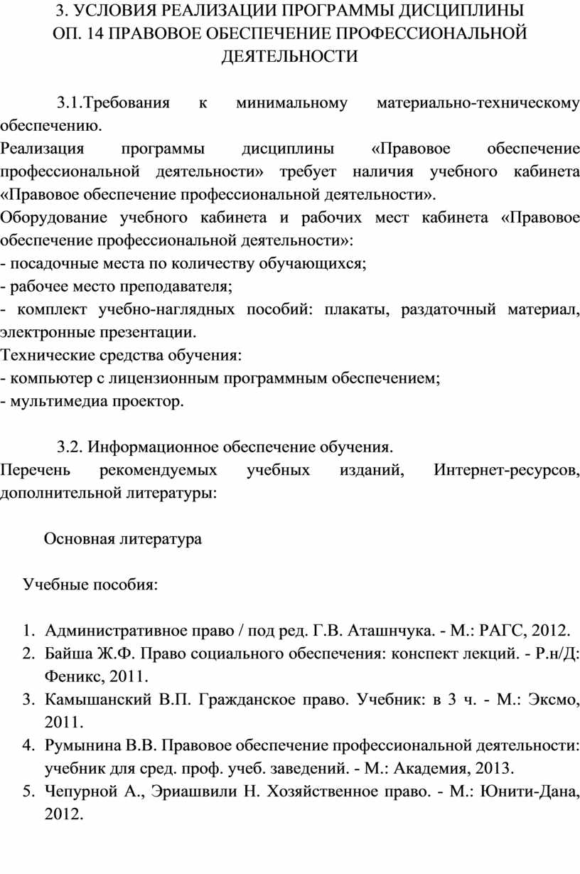 3.условия реализации программы учебной дисциплины ОП. 14 ПРАВОВОЕ ОБЕСПЕЧЕНИЕ ПРОФЕССИОНАЛЬНОЙ ДЕЯТЕЛЬНОСТИ