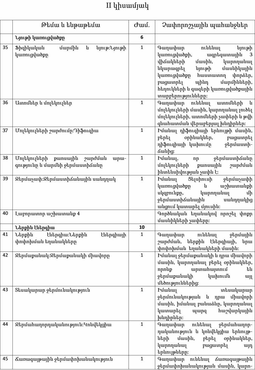 Գաղափար ունենալ նյութի կառուցվածքի, ագրեգատային 3 վիճակների մասին, կարողանալ նկարագրել նյութի մասնիկային կառուցվածքը հաստատող փորձեր, բացատրել պինդ մարմինների, հեղուկների և գազերի կառուցվածքային տարբերությունները: |
