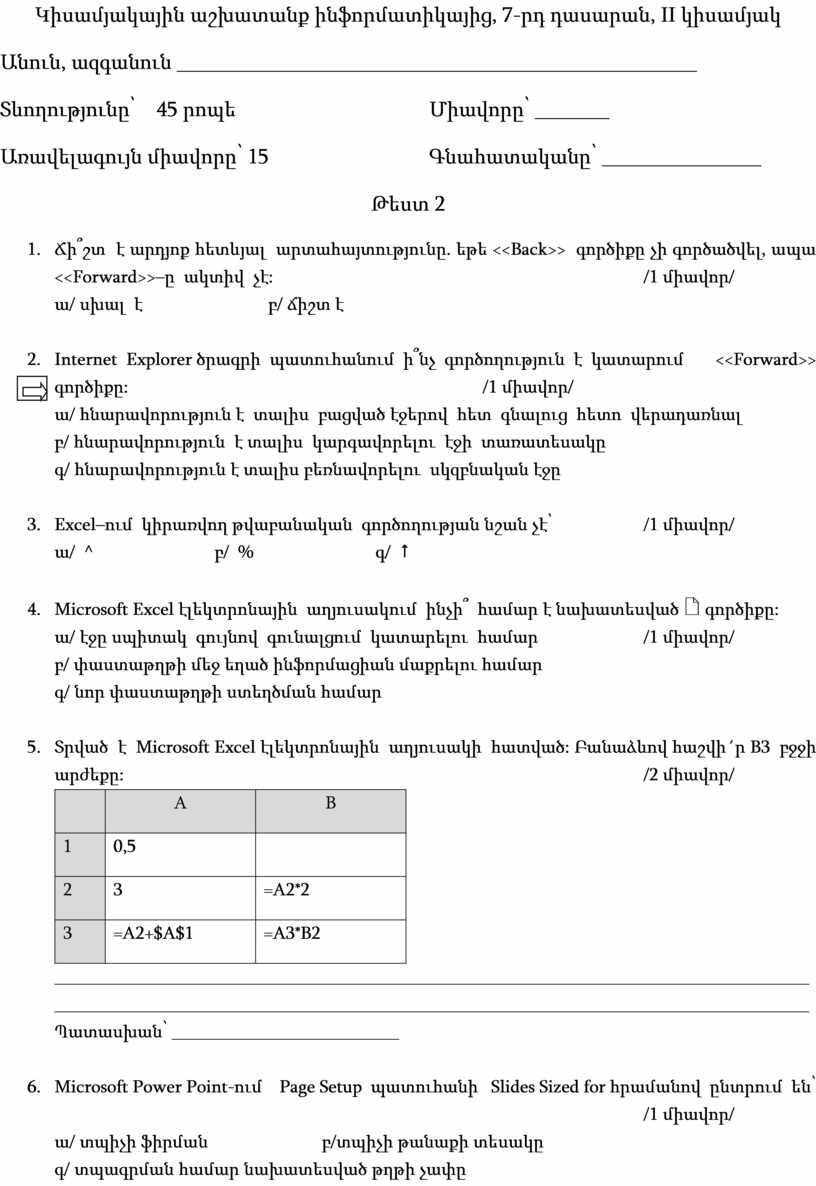 Տևողությունը՝ 45 րոպե Միավորը՝ _______
