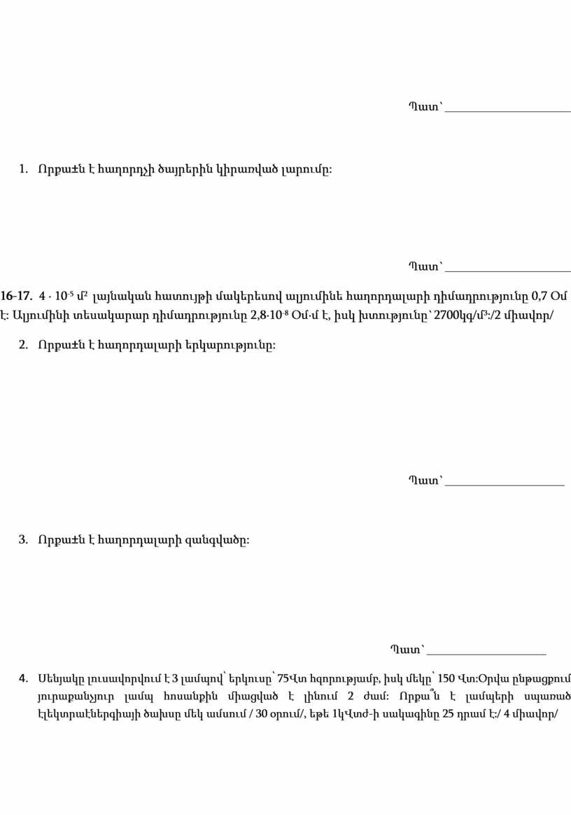 16-17. 4 ∙ 10-5 մ2 լայնական հատույթի մակերեսով ալյումինե հաղորդալարի դիմադրությունը 0,7 Օմ է: Ալյումինի տեսակարար դիմադրությունը 2,8∙10-8 Օմ∙մ է, իսկ խտությունը`2700կգ/մ3:/2 միավոր/