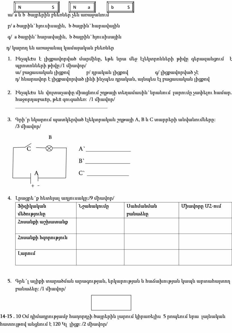 5. Գրի´ր էլեկտրական հոսանքի երկու ազդեցություն: /2 միավոր/