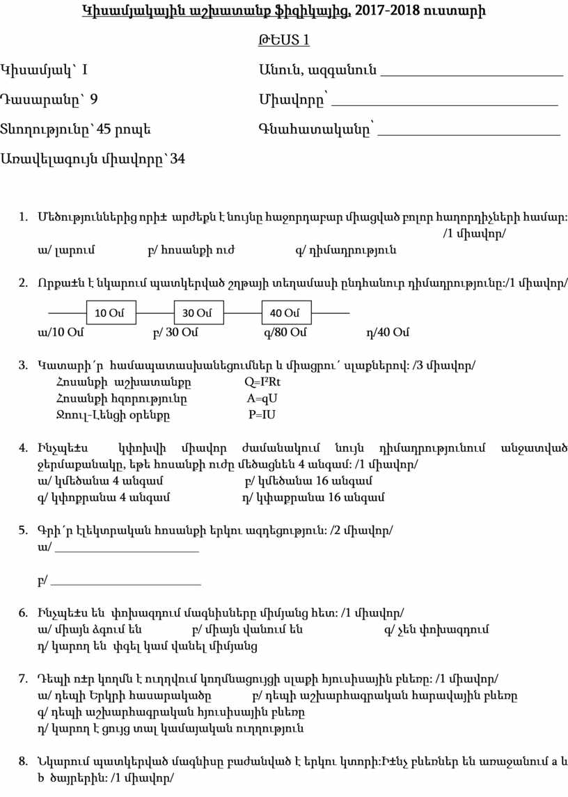Կիսամյակային աշխատանք ֆիզիկայից, 2017-2018 ուստարի