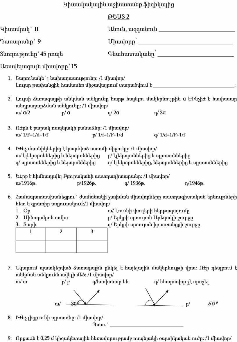 2. Լույսի ճառագայթի անկման անկյունը հարթ հայելու մակերևույթին α է:Ինչի± է հավասար անդրադարձման անկյունը: /1 միավոր/