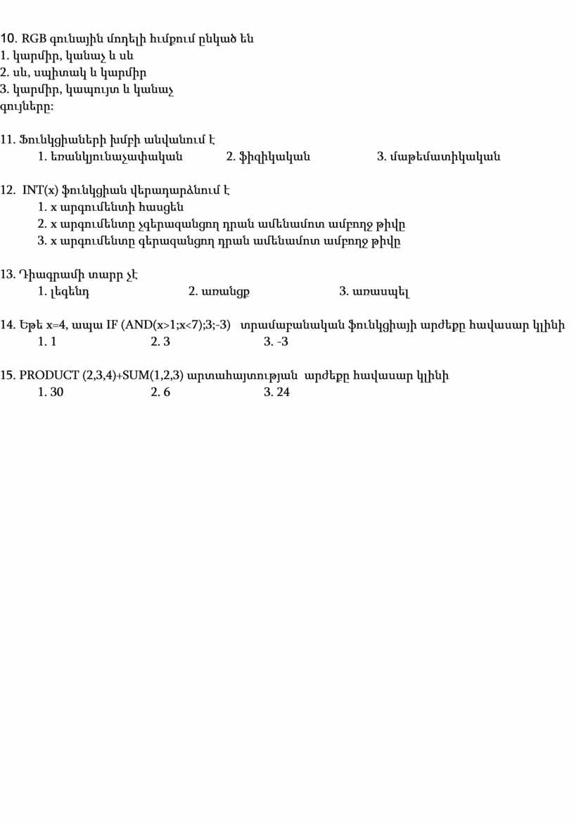 15. PRODUCT (2,3,4)+SUM(1,2,3) արտահայտության արժեքը հավասար կլինի
