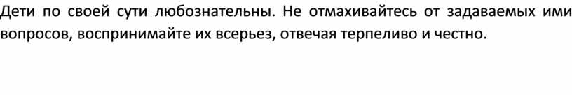 Дети по своей сути любознательны. Не отмахивайтесь от задаваемых ими вопросов, воспринимайте их всерьез, отвечая терпеливо и честно.