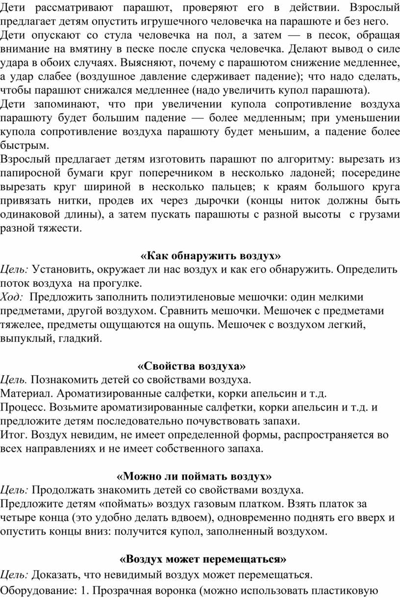 Цель: Развивать познавательную активность детей, инициативность; развивать способность устанавливать причинно-следственные связи на основе элементарного эксперимента и делать выводы; уточнить понятие детей о том, что воздух – это не «невидимка», а реально существующий газ; расширять представления детей о значимости воздуха в жизни человека, совершенствовать опыт детей в соблюдении правил безопасности при проведении экспериментов.