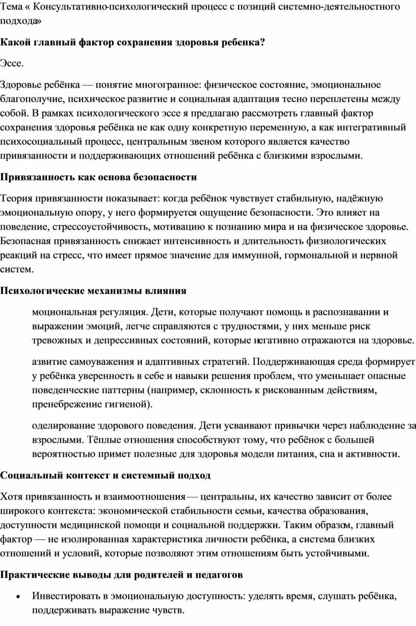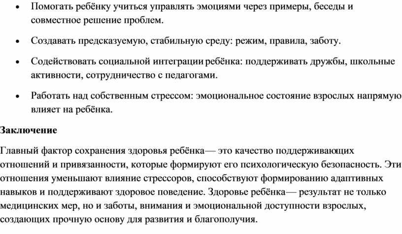 Главный фактор сохранения здоровья ребёнка — это качество поддерживающих отношений и привязанности, которые формируют его психологическую безопасность. Эти отношения уменьшают влияние стрессоров, способствуют формированию адаптивных навыков и поддерживают здоровое поведение. Здоровье ребёнка — результат не только медицинских мер, но и заботы, внимания и эмоциональной доступности взрослых, создающих прочную основу для развития и благополучия.
