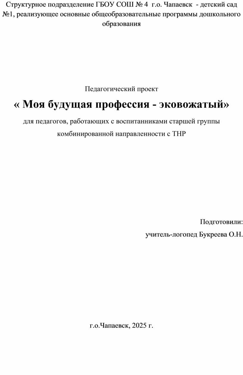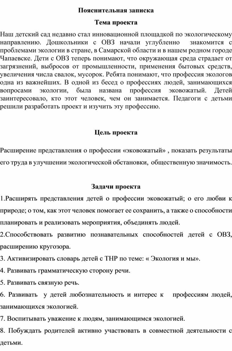 Наш детский сад недавно стал инновационной площадкой по экологическому направлению. Дошкольники с ОВЗ начали углубленно знакомится с проблемами экологии в стране, в Самарской области и в нашем родном городе Чапаевске. Дети с ОВЗ теперь понимают, что окружающая среда страдает от загрязнений, выбросов от промышленности, применения бытовых средств, увеличения числа свалок, мусорок. Ребята понимают, что профессия экологов одна из важнейших. В одной из бесед о профессиях людей, занимающихся вопросами экологии, была названа профессия эковожатый. Детей заинтересовало, кто этот человек, чем он занимается. Педагоги с детьми решили разработать проект и изучить эту профессию.