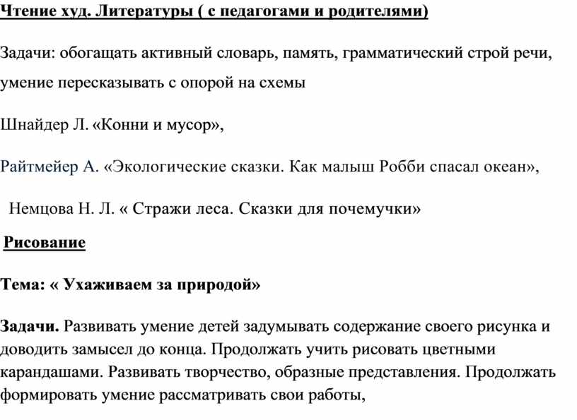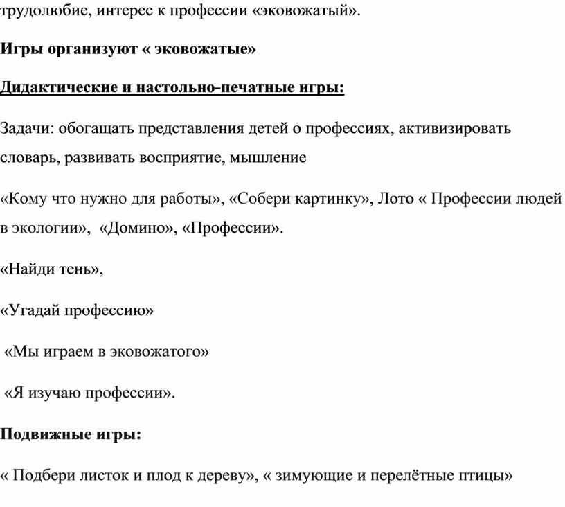 Укрывание стволов деревьев, согребание осенних листьев Задачи: формировать заботливое отношение к природе, учить детей наблюдать за трудом взрослых, оказывать посильную помощь, развивать трудолюбие, интерес к профессии «эковожатый». Игры организуют « эковожатые» Дидактические и настольно-печатные игры: Задачи: обогащать представления детей о профессиях, активизировать словарь, развивать восприятие, мышление «Кому что нужно для работы», «Собери картинку», Лото « Профессии людей в экологии», «Домино», «Профессии». «Найди тень», «Угадай профессию» «Мы играем в эковожатого» «Я изучаю профессии». Подвижные игры: « Подбери листок и плод к дереву», « зимующие и перелётные птицы» Чтение худ. Литературы ( с педагогами и родителями) Задачи: обогащать активный словарь, память, грамматический строй речи, умение пересказывать с опорой на схемы Шнайдер Л. «Конни и мусор», Райтмейер А. «Экологические сказки. Как малыш Робби спасал океан»,