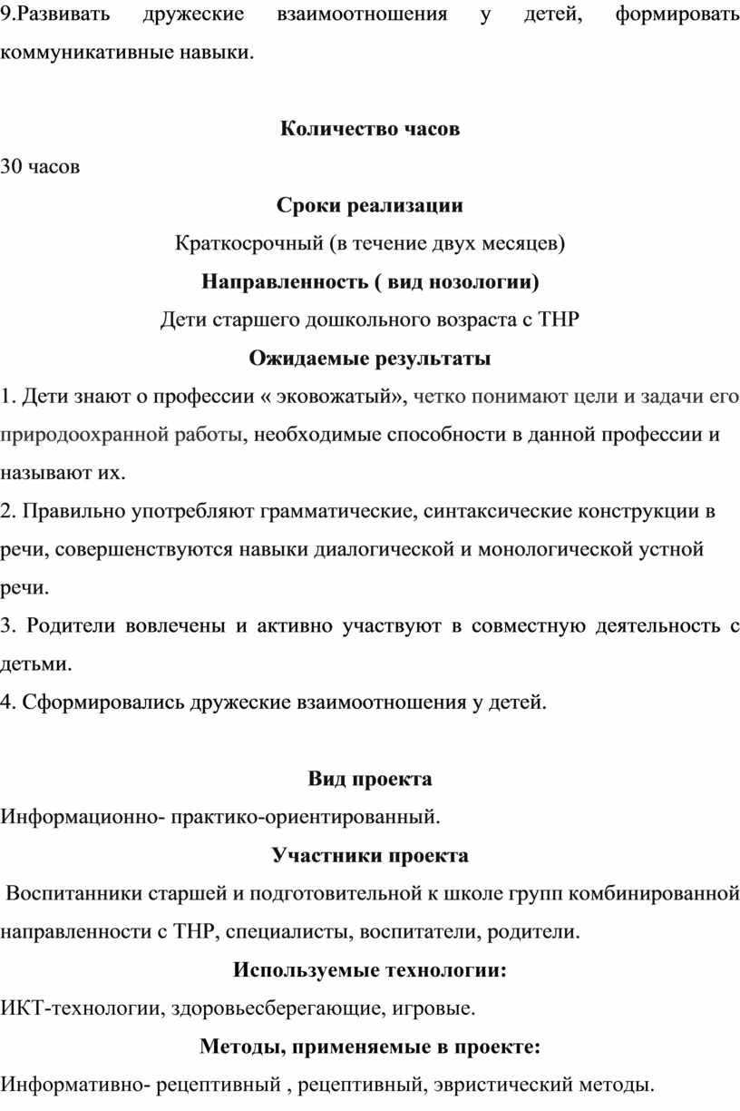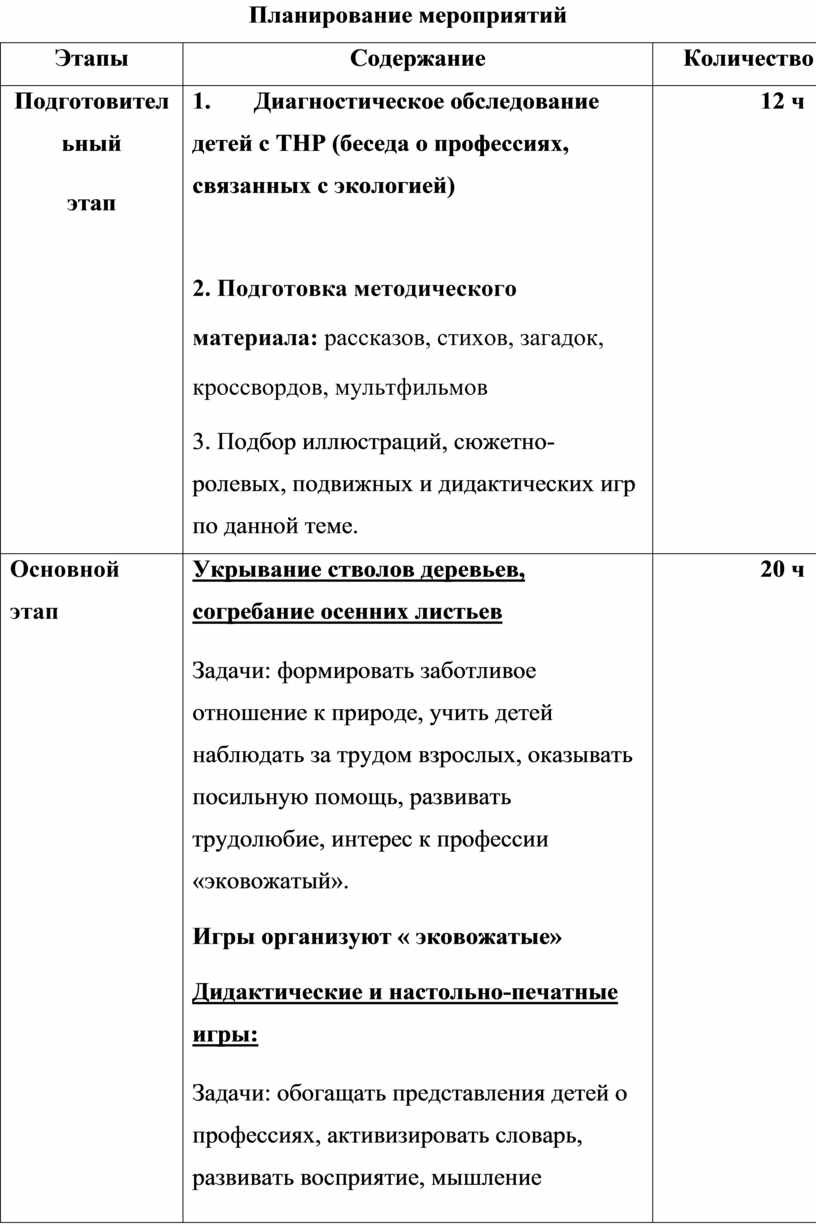 1. Диагностическое обследование детей с ТНР (беседа о профессиях, связанных с экологией) 2. Подготовка методического материала: рассказов, стихов, загадок, кроссвордов, мультфильмов3. Подбор иллюстраций, сюжетно-ролевых, подвижных и дидактических игр по данной теме. |