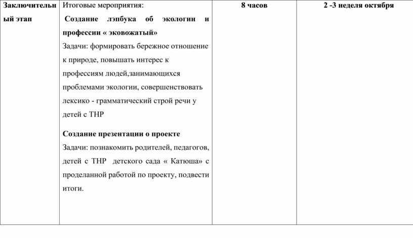 Итоговые мероприятия: Создание лэпбука об экологии и профессии « эковожатый» Задачи: формировать бережное отношение к природе, повышать интерес к профессиям людей,занимающихся проблемами экологии, совершенствовать лексико - грамматический строй речи у детей с ТНР Создание презентации о проекте Задачи: познакомить родителей, педагогов, детей с ТНР детского сада « Катюша» с проделанной работой по проекту, подвести итоги.
