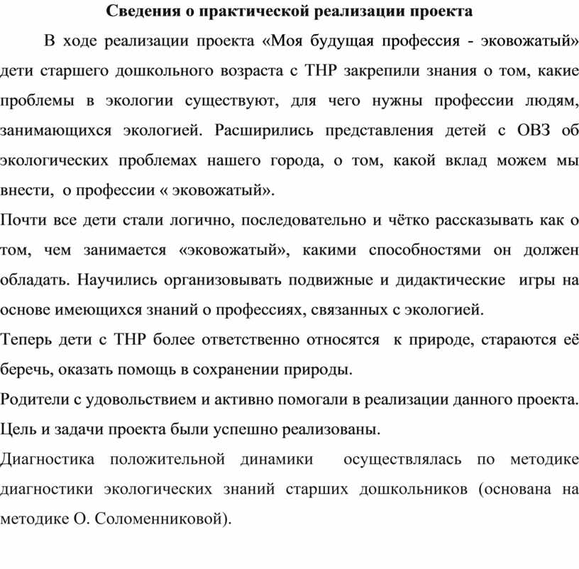 В ходе реализации проекта «Моя будущая профессия - эковожатый» дети старшего дошкольного возраста с ТНР закрепили знания о том, какие проблемы в экологии существуют, для чего нужны профессии людям, занимающихся экологией. Расширились представления детей с ОВЗ об экологических проблемах нашего города, о том, какой вклад можем мы внести, о профессии « эковожатый».