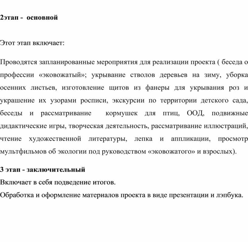 Проводятся запланированные мероприятия для реализации проекта ( беседа о профессии «эковожатый»; укрывание стволов деревьев на зиму, уборка осенних листьев, изготовление щитов из фанеры для укрывания роз и украшение их узорами росписи, экскурсии по территории детского сада, беседы и рассматривание кормушек для птиц, ООД, подвижные дидактические игры, творческая деятельность, рассматривание иллюстраций, чтение художественной литературы, лепка и аппликации, просмотр мультфильмов об экологии под руководством «эковожатого» и взрослых).