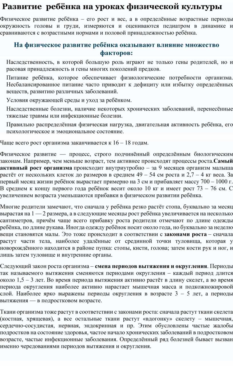Физическое развитие — процесс, строго подчинённый определённым биологическим законам. Например, чем меньше возраст, тем активнее происходят процессы роста.Самый активный рост организма происходит внутриутробно – за 9 месяцев организм малыша растёт от нескольких клеток до размеров в среднем 49 – 54 см роста и 2,7 – 4 кг веса. За первый месяц жизни ребёнок вырастает примерно на 3 см и прибавляет массу 700 – 1000 г. В среднем к концу первого года ребёнок весит около 10 кг и имеет рост 73 – 76 см. С увеличением возраста уменьшаются прибавки в физическом развитии ребёнка.