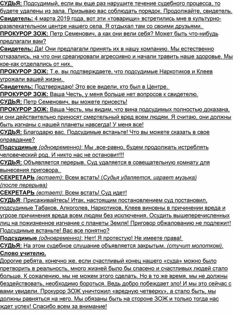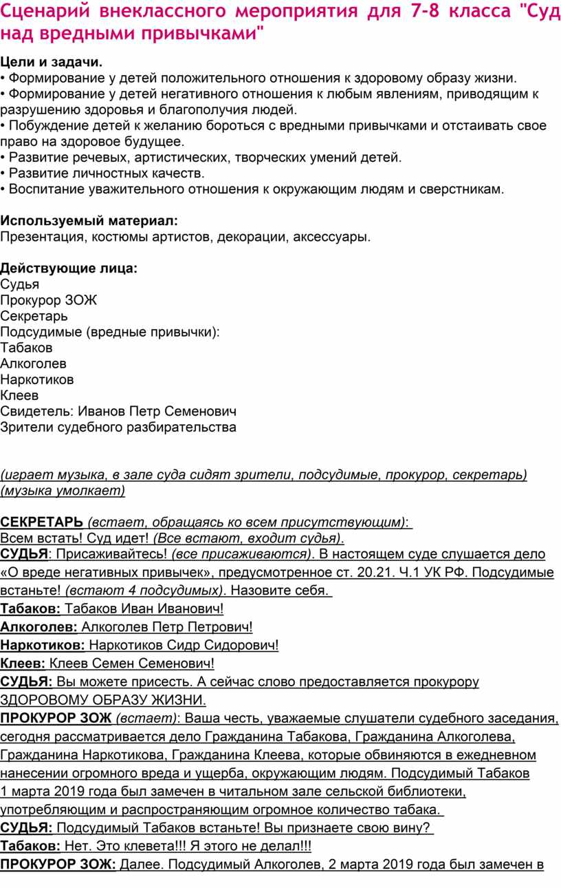 Сценарий внеклассного мероприятия для 7-8 класса "Суд над вредными привычками"