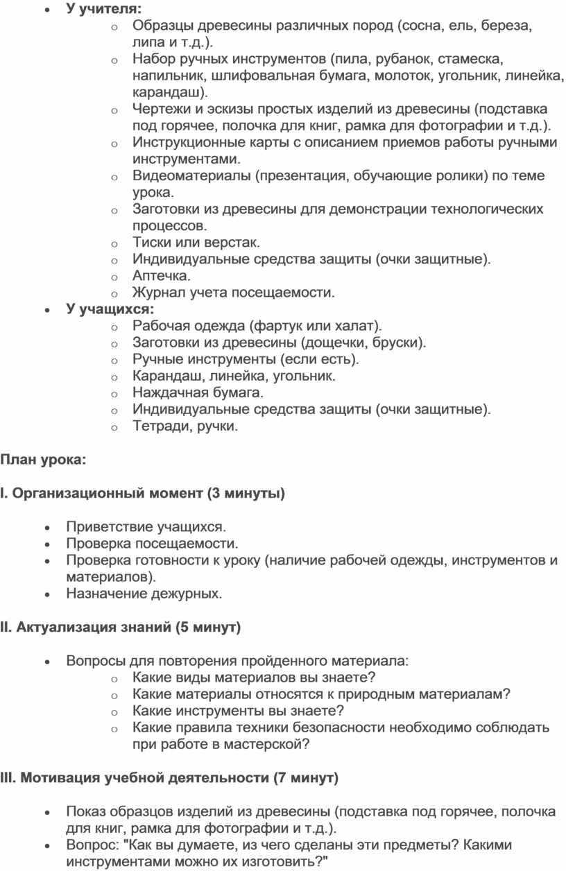 · Ознакомить учащихся с основными ручными инструментами для обработки древесины и приемами работы с ними.