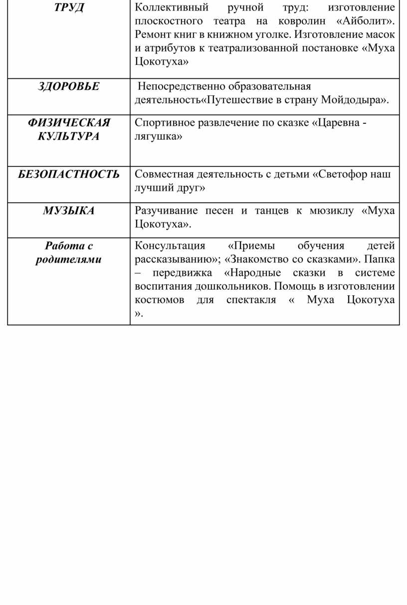 Консультация «Приемы обучения детей рассказыванию»; «Знакомство со сказками». Папка – передвижка «Народные сказки в системе воспитания дошкольников. Помощь в изготовлении костюмов для спектакля « Муха Цокотуха ». |