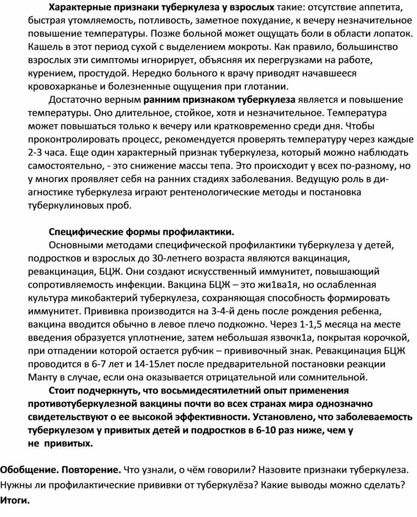 3. Обобщение. Повторение. Что узнали, о чём говорили? Назовите признаки туберкулеза. Нужны ли профилактические прививки от туберкулёза? Какие выводы можно сделать? Итоги.