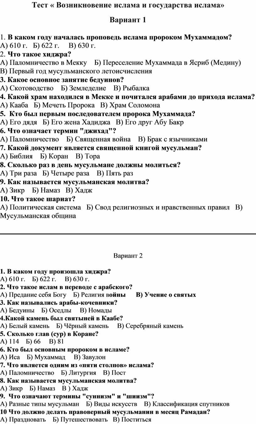2. Что такое хиджра? A) Паломничество в Мекку Б) Переселение Мухаммада в Ясриб (Медину) В) Первый год мусульманского летоисчисления 3. Какое основное занятие бедуинов? A) Скотоводство Б) Земледелие В) Рыбалка 4. Какой храм находился в Мекке и почитался арабами до прихода ислама? А) Кааба Б) Мечеть Пророка В) Храм Соломона 5. Кто был первым последователем пророка Мухаммада? A) Его дядя Б) Его жена Хадиджа В) Его друг Абу Бакр 6. Что означает термин "джихад"? A) Паломничество Б) Священная война В) Брак с язычниками 7. Какой документ является священной книгой мусульман? A) Библия Б) Коран В) Тора 8. Сколько раз в день мусульмане должны молиться? A) Три раза Б) Четыре раза В) Пять раз 9. Как называется мусульманская молитва? A) Зикр Б) Намаз В) Хадж 10. Что такое шариат? A) Политическая система Б) Свод религиозных и нравственных правил В) Мусульманская община