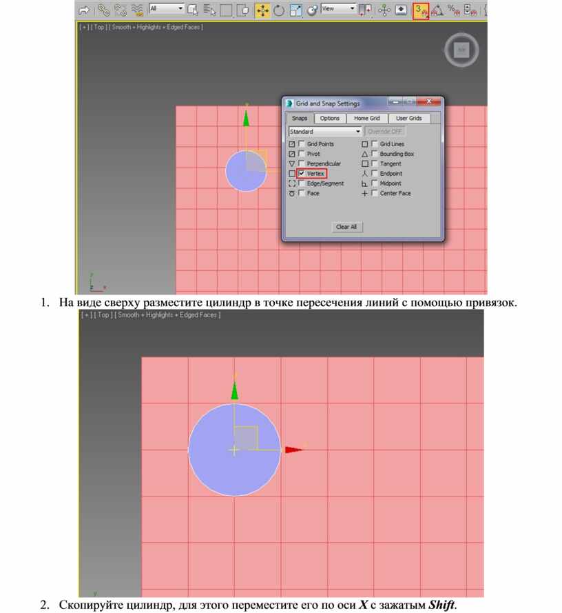 4. На виде сверху разместите цилиндр в точке пересечения линий с помощью привязок.