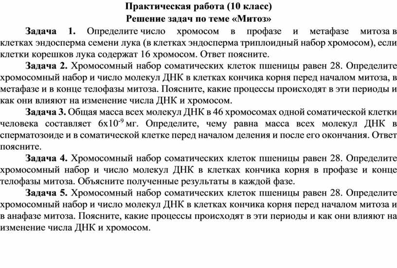 Задача 2. Хромосомный набор соматических клеток пшеницы равен 28. Определите хромосомный набор и число молекул ДНК в клетках кончика корня перед началом митоза, в метафазе и в конце телофазы митоза. Поясните, какие процессы происходят в эти периоды и как они влияют на изменение числа ДНК и хромосом.