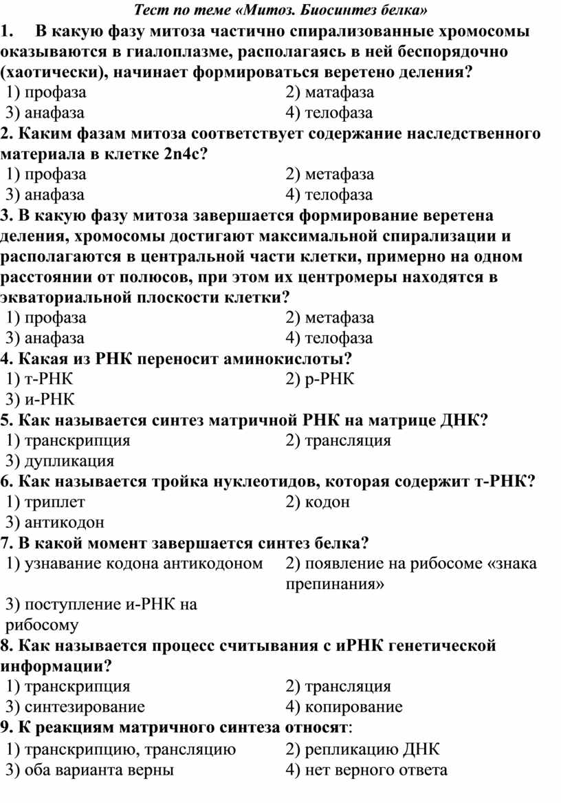 Тест по теме «Митоз. Биосинтез белка»