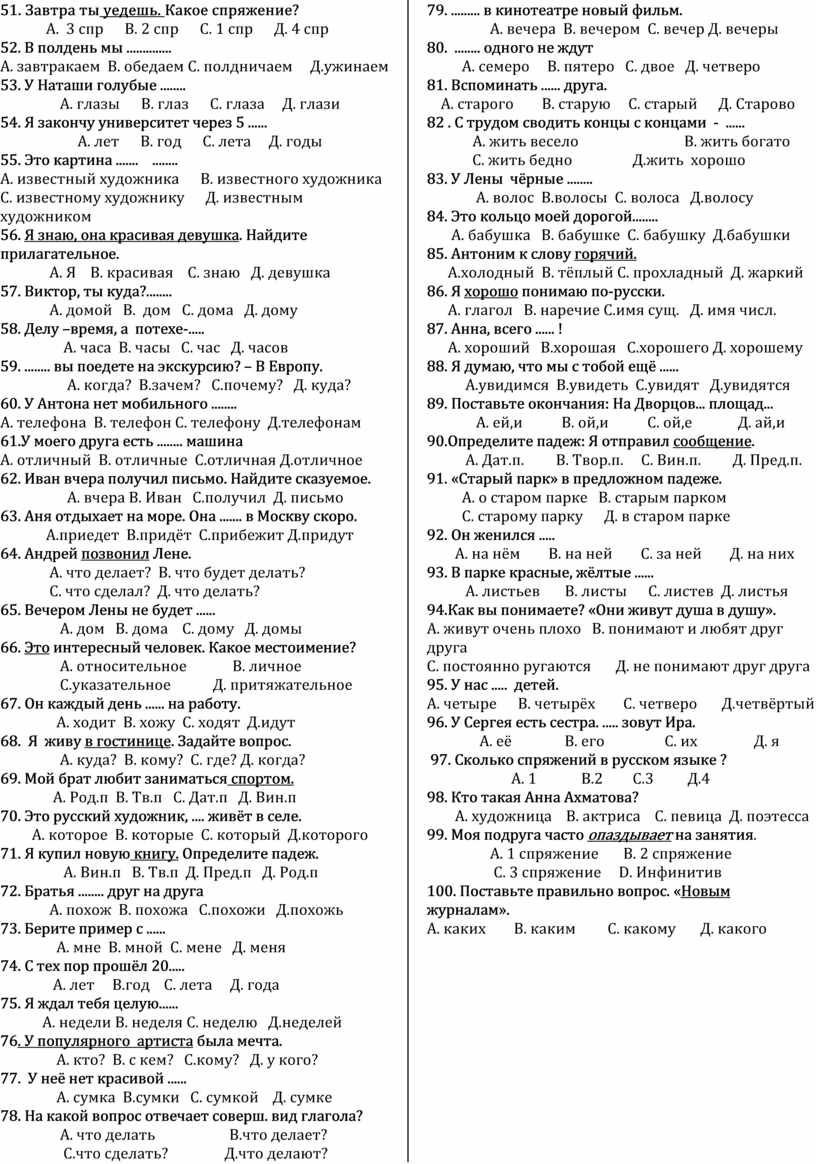 А. Дат.п. В. Твор.п. С. Вин.п. Д. Пред.п.