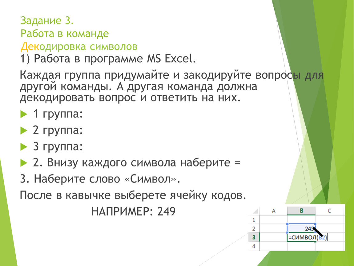 Каждая группа придумайте и закодируйте вопросы для другой команды. А другая команда должна декодировать вопрос и ответить на них.