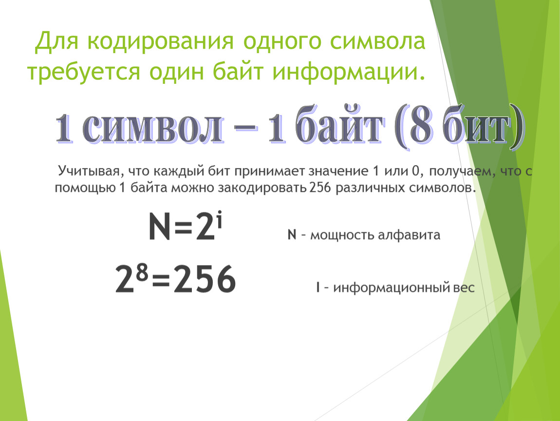 Учитывая, что каждый бит принимает значение 1 или 0, получаем, что с помощью 1 байта можно закодировать 256 различных символов.