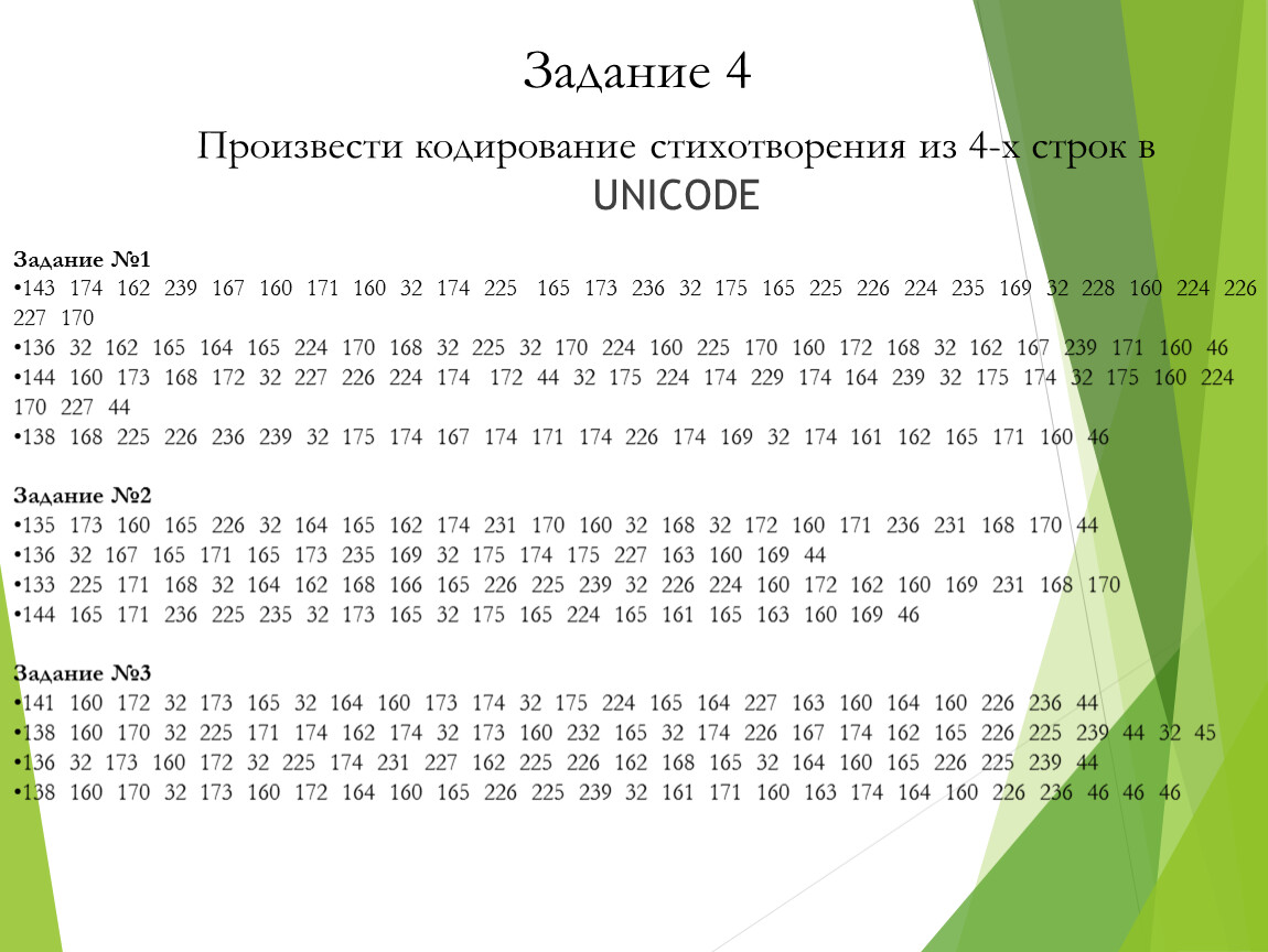 Произвести кодирование стихотворения из 4-х строк в UNICODE