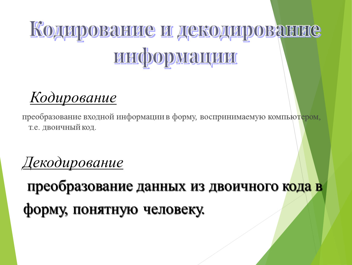 преобразование входной информации в форму, воспринимаемую компьютером, т.е. двоичный код.