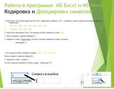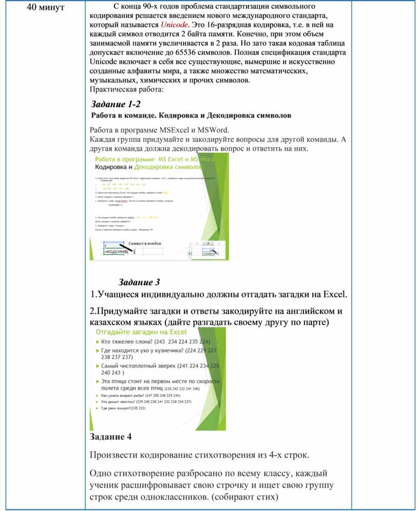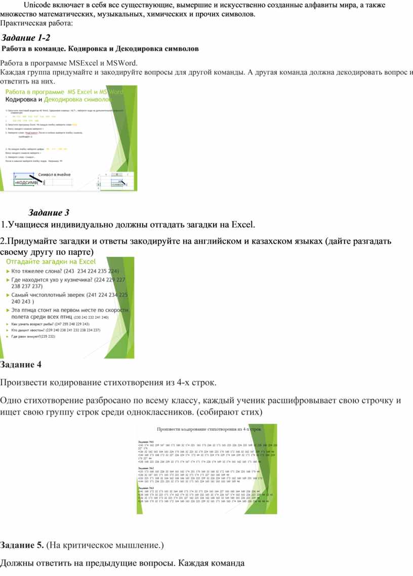 С конца 90-х годов проблема стандартизации символьного кодирования решается введением нового международного стандарта, который называется Unicode. Это 16-разрядная кодировка, т.е. в ней на каждый символ отводится 2 байта памяти. Конечно, при этом объем занимаемой памяти увеличивается в 2 раза. Но зато такая кодовая таблица допускает включение до 65536 символов. Полная спецификация стандарта Unicode включает в себя все существующие, вымершие и искусственно созданные алфавиты мира, а также множество математических, музыкальных, химических и прочих символов. Практическая работа: Задание 1-2 Работа в команде. Кодировка и Декодировка символов Работа в программе MSExcel и MSWord. Каждая группа придумайте и закодируйте вопросы для другой команды. А другая команда должна декодировать вопрос и ответить на них.