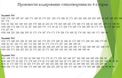 Задание 4 Произвести кодирование стихотворения из 4-х строк. Одно стихотворение разбросано по всему классу, каждый ученик расшифровывает свою строчку и ищет свою группу строк среди одноклассников. (собирают стих)