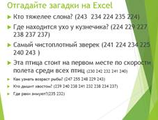 Задание 3 1.Учащиеся индивидуально должны отгадать загадки на Excel. 2.Придумайте загадки и ответы закодируйте на английском и казахском языках (дайте разгадать своему другу по парте)