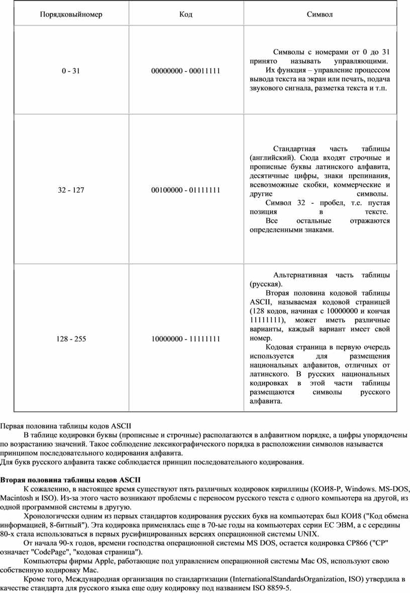 символы по их начертанию, а компьютер - по их коду Какой именно восьмиразрядный двоичный код поставить в соответствие каждому символу?Все символы компьютерного алфавита пронумерованы от 0 до 255. Каждому номеру соответствует восьмиразрядный двоичный код от 00000000 до 11111111. Этот код просто порядковый номер символа в двоичной системе счисления. Таблица, в которой всем символам компьютерного алфавита поставлены в соответствие порядковые номера, называется таблицей кодировки.Для разных типов ЭВМ используются различные таблицы кодировки. Международным стандартом для ПК стала таблица ASCII (читается аски) (Американский стандартный код для информационного обмена). Таблица кодов ASCII делится на две части. Международным стандартом является лишь первая половина таблицы, т.е. символы с номерами от 0 (00000000), до 127 (01111111).Структура таблицы кодировки ASCII