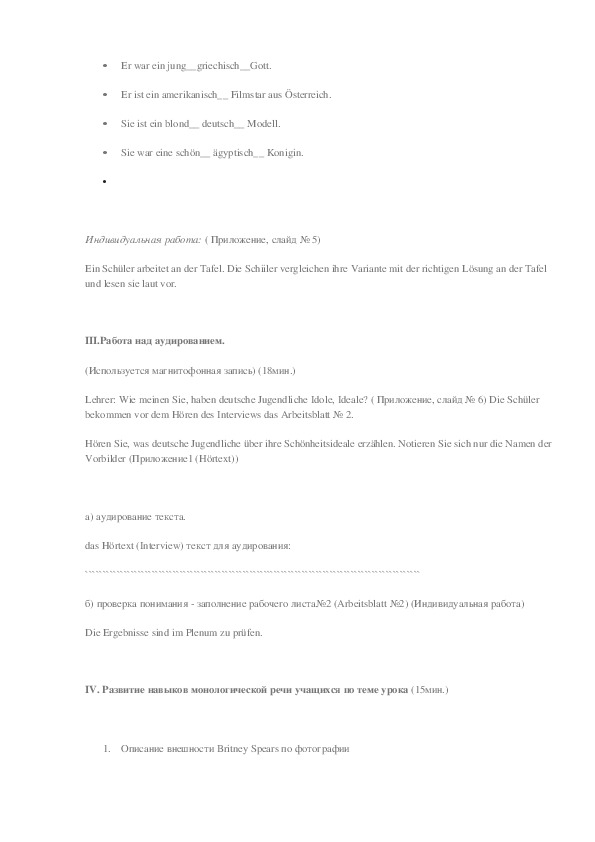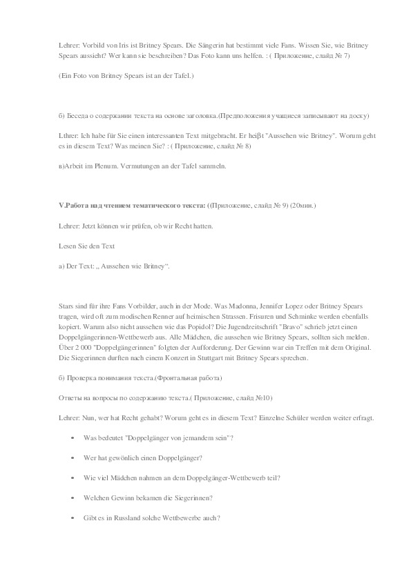 Lthrer: Ich habe für Sie einen interessanten Text mitgebracht. Ег heiβt "Aussеhеn wie Вгitnеу". Worum geht