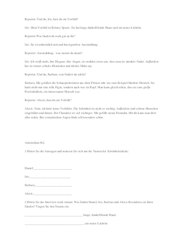 1.Hören Sie die Aussagen und notieren Sie sich nur die Namen der Schönheitsideale: