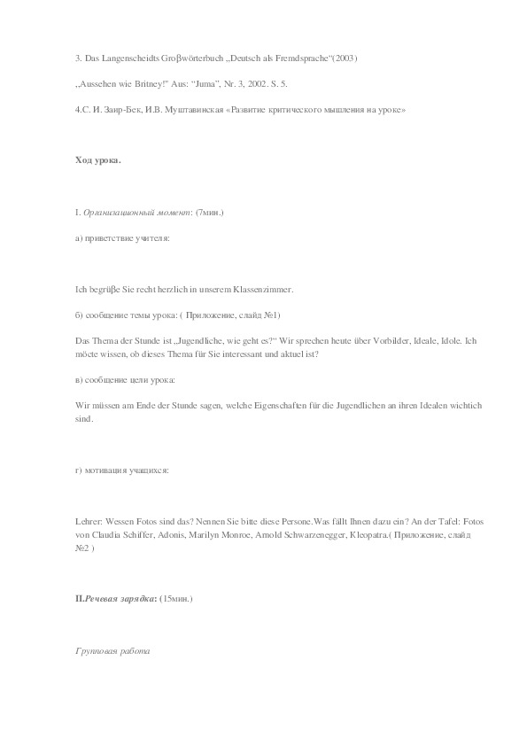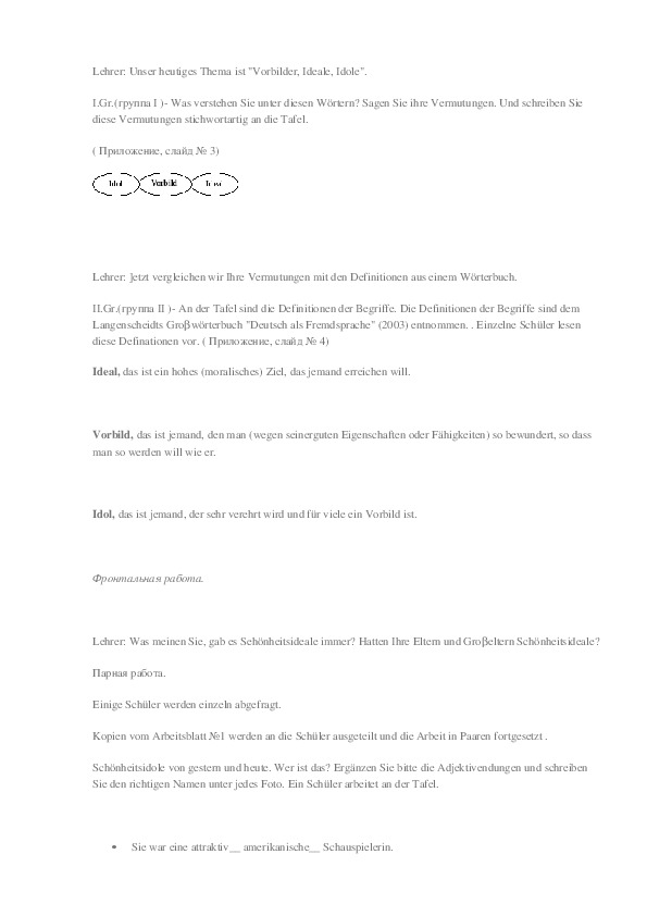 Группoвая работаLehrer: Unser heutiges Thema ist "Vorbilder, Ideale, Idole".