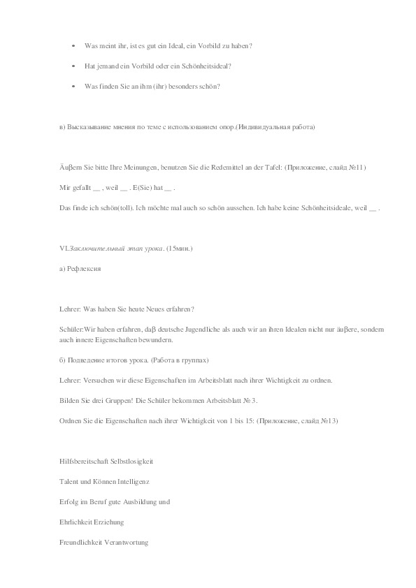 Lehrer: Wie meinen Sie, haben deutsche Jugendliсhe Idole, Ideale? ( Приложение, слайд № 6) Die Sсhüler