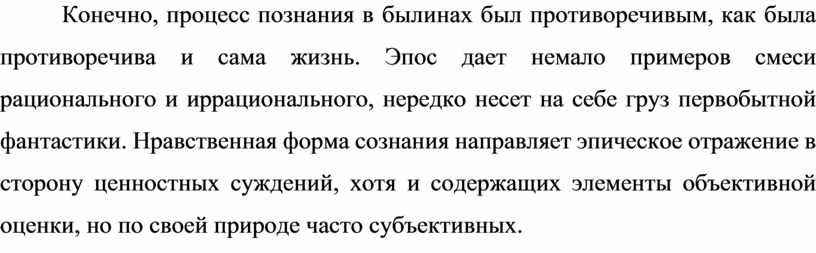 Конечно, процесс познания в былинах был противоречивым, как была противоречива и сама жизнь. Эпос дает немало примеров смеси рационального и иррационального, нередко несет на себе груз первобытной фантастики. Нравственная форма сознания направляет эпическое отражение в сторону ценностных суждений, хотя и содержащих элементы объективной оценки, но по своей природе часто субъективных.